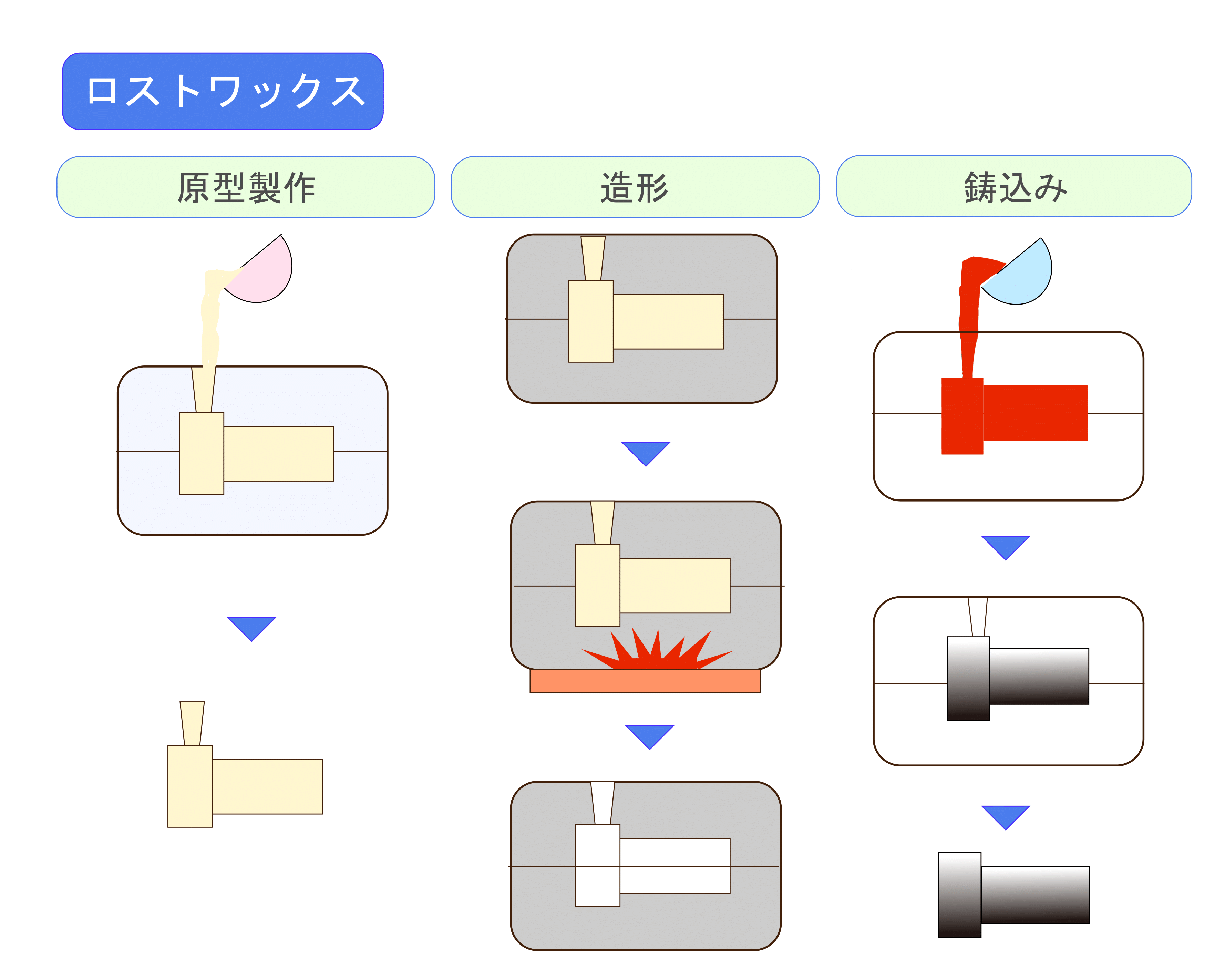 砂型鋳造・ダイカスト(金型鋳造)・ロストワックス法とは溶けた金属を型に入れて固める工法(総称して鋳造法)ですが、その違いや管理方法がわからないという方も少なくありません。